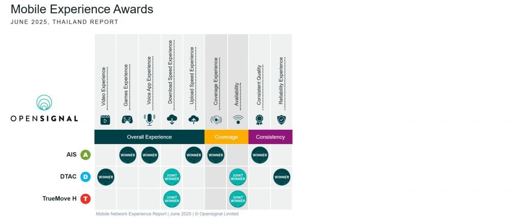 Selon la dernière période de surveillance de 90 jours effectuée par Opensignal, AIS a consolidé sa position de leader en matière de performances haut de gamme, tandis que DTAC et TrueMove H affichent des atouts communs en termes de disponibilité et de vitesse.